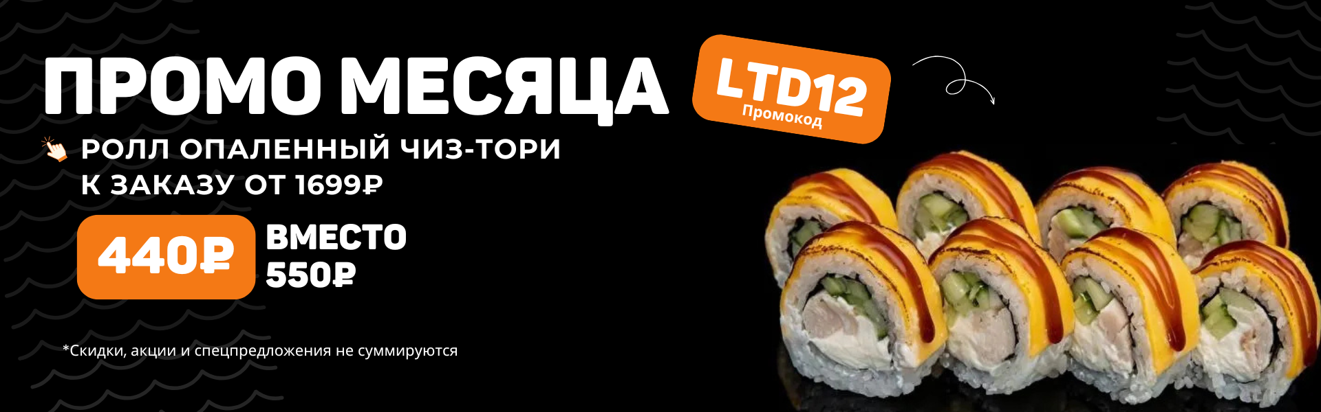 - При оформлении заказа введите промокод LTD12 и добавьте ролл "Опаленный чиз-тори" в корзину.
